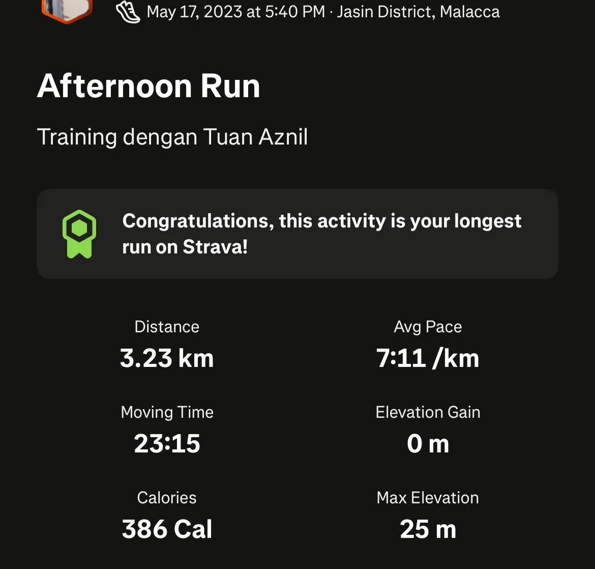 Time ni tengah prep untuk Melaka Half and Tuan Aznil ajak aku dengan Imran lari route luar kampus. Time nila dia ajar cara nak lari berbukit turun and naik macam mana and makan jalan macam mana untuk jimat masa. Banyak lagi larian selain ni and banyak tips dia bagi.